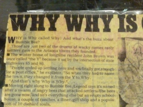 This cursory survey through Why told Zoytlow that the ganglion of the place was at the Texaco station, the Why-Not Travel Shop. The place was surprisingly large and cool inside. Under a low ceiling and along rows of shelving, lay a remarkable range of groceries, camping equipment, and souvenirs. The place appeared empty except for a short man at the counter. He had a serious beard which covered the first word of a message on his tee shirt so that all that could be read was “can count to 10.” Zoytlow put aside an impulse ask the Bearded One to lift that hairy sheaf so that the first word or words of the message could be read. It would have to be something like “my horse” or ‘“even idiots,” but supposing it simply said “Why.”  Instead Zoytow began with an apology: he had come to Why to ask about the name, probably a near-predictable request?  The Bearded One smiled (a relief to PNZ) and motioned him to a glass counter beneath which was taped a yellowed news article on peculiar Arizona place names. Prominent among them was Why.  Zoytlow read the relevant paragraph.
